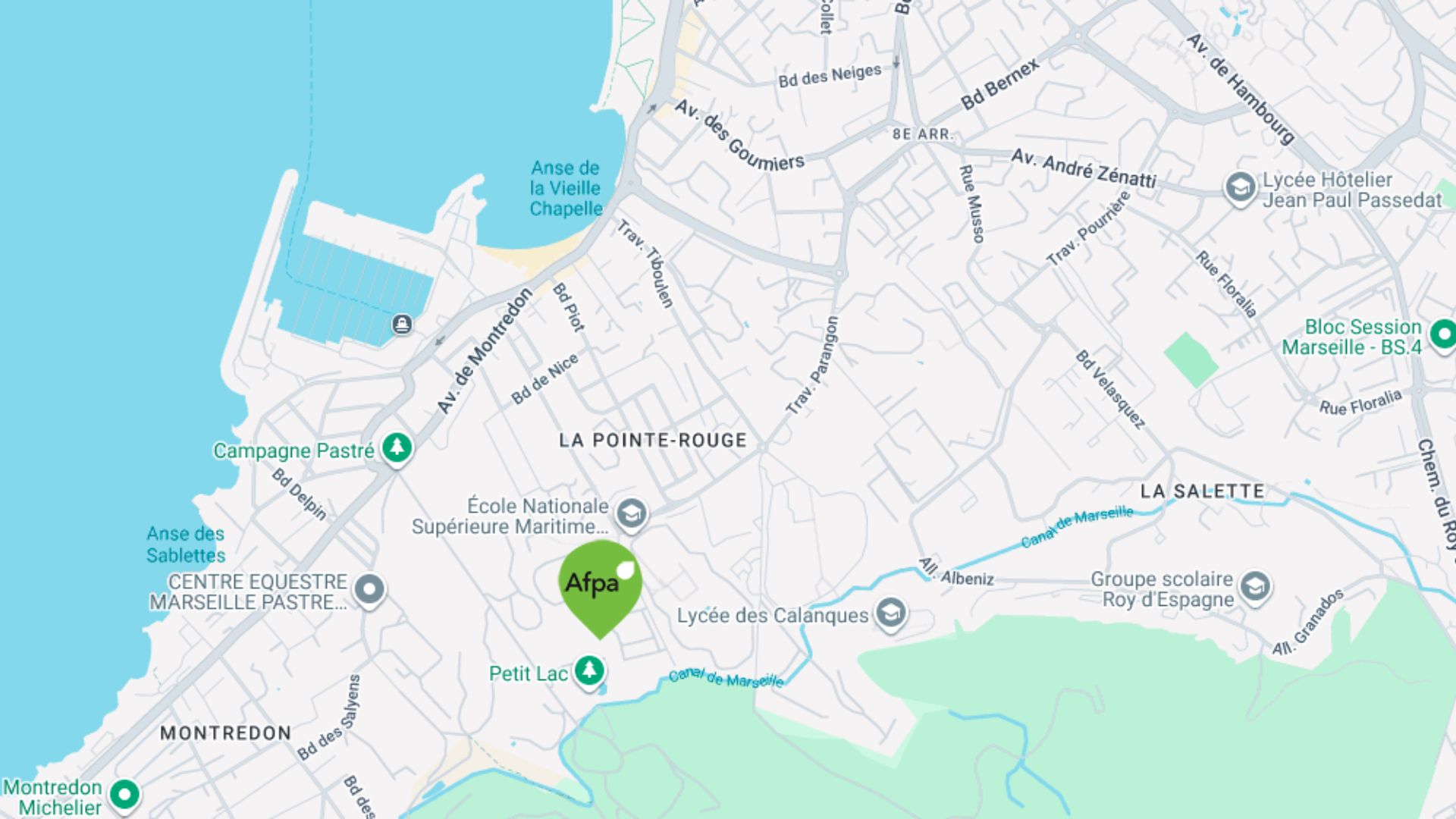 Venant de l’A7 Passer sous le tunnel du Vieux Port, sortir côté boulevard Charles Livon et rejoindre la Corniche Kennedy en suivant le bord de mer jusqu’à la statue “David“, poursuivre sur le bord de mer jusqu’au Port de la Pointe Rouge, continuer sans descendre sur le Port et entrer “Entrée n°3“, Afpa sur la gauche 30 mètres plus bas.